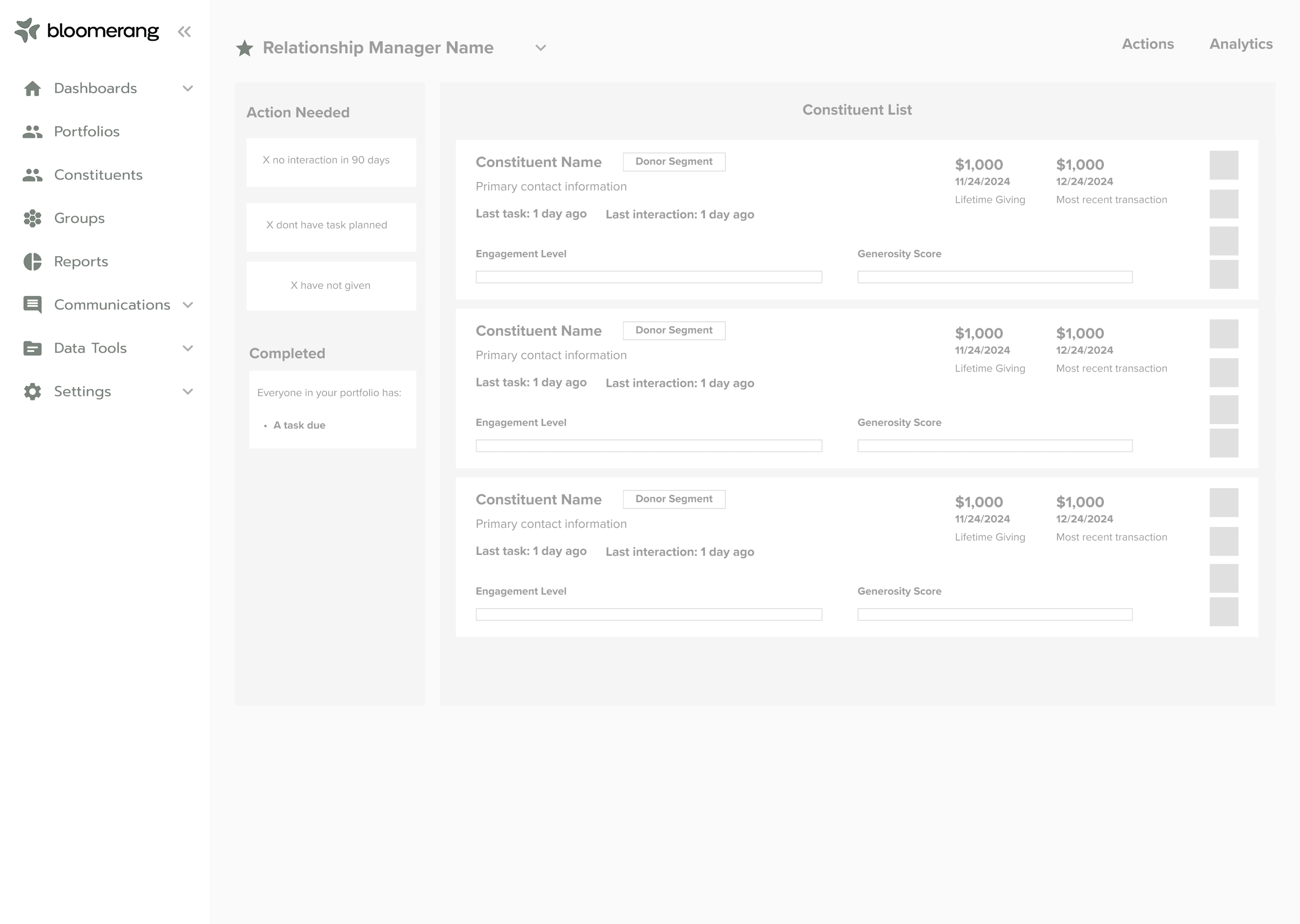 Relationship managers were struggling with fragmented data and inefficient workflows when managing major donor portfolios in Bloomerang CRM. Pain points included: