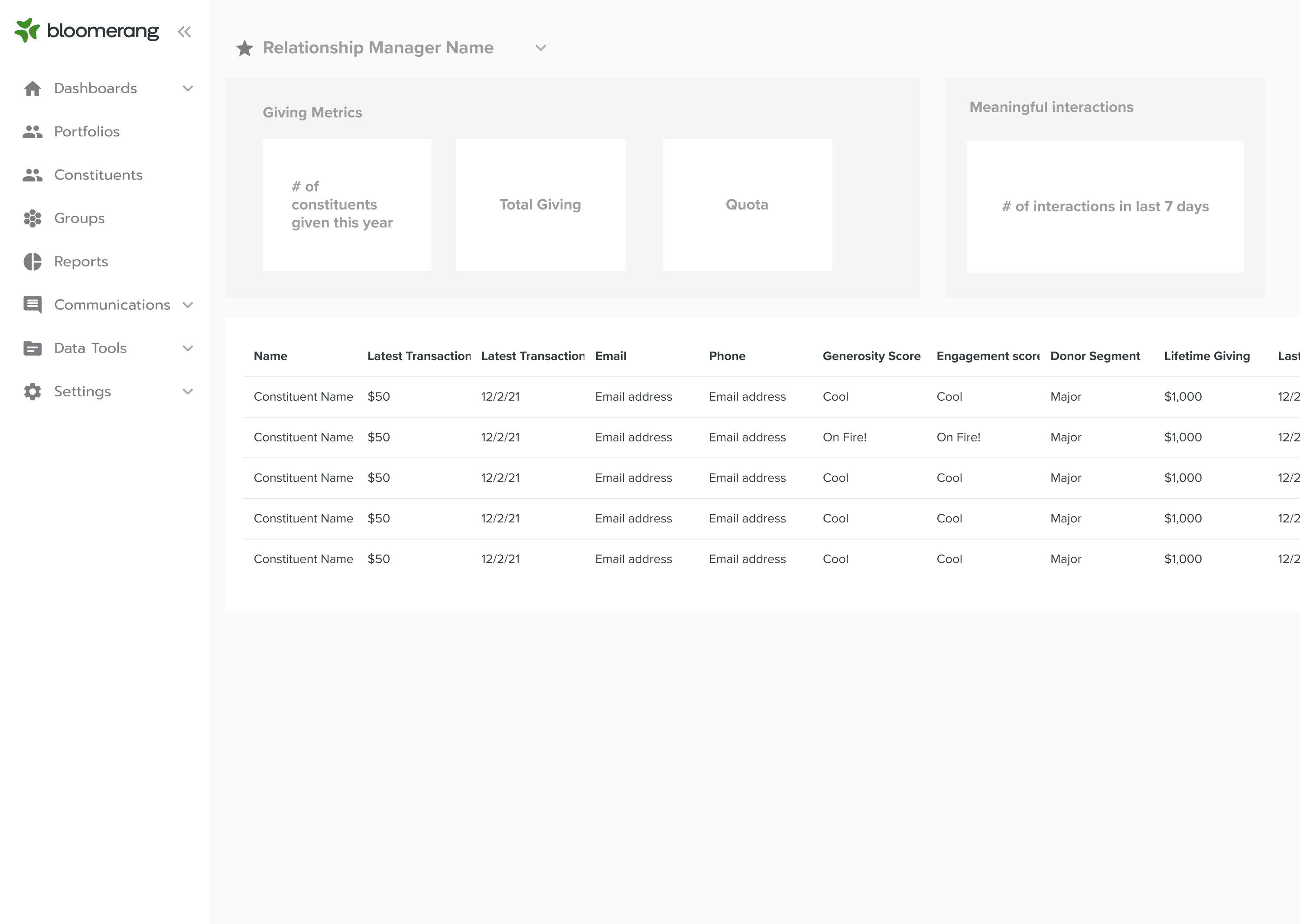 Constituent Overview: Displayed key details like lifetime giving, donor segment, engagement score, and recent interactions, enabling relationship managers to understand their portfolio without needing to dive deeper into individual profiles.